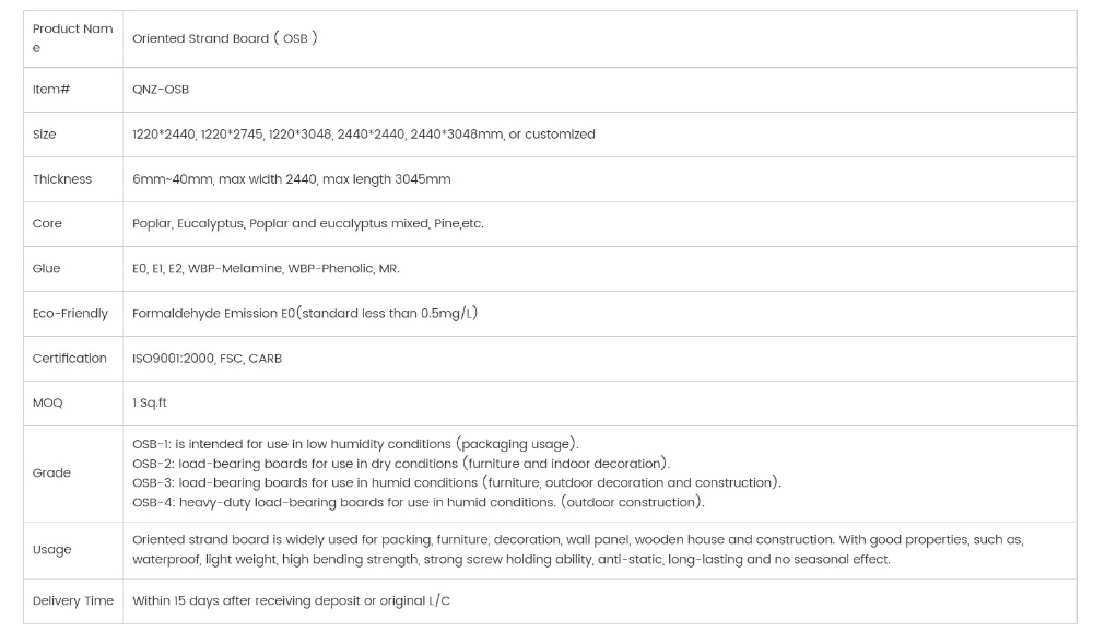 1. High environmental performance: The authentic osb board is produced according to the high-level environmental protection standards. It is safe to use with ISO9001:2000, FSC, CARB Certification. The glue used in the osb board is extracted from formaldehyde-free resin.