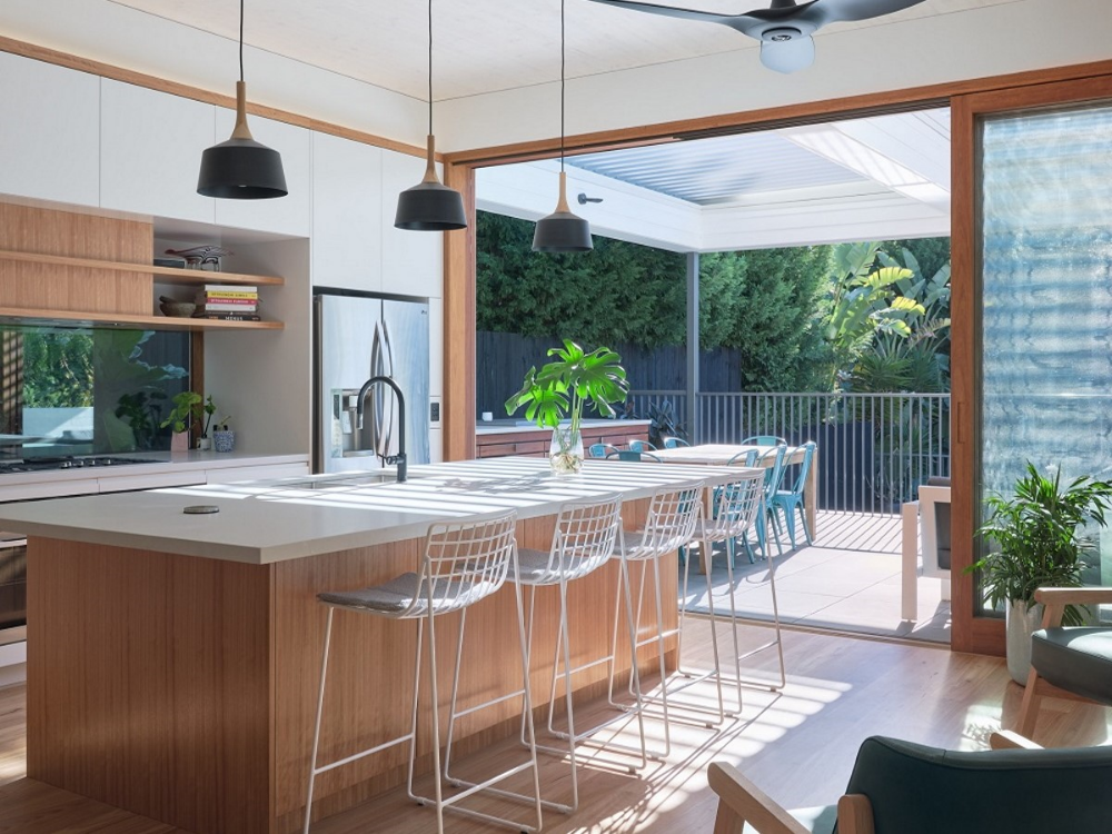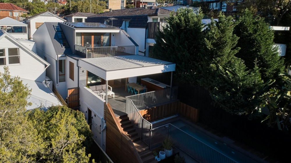 The entry of the home was reconfigured so that you enter the house at street-level, via a green roof. This arrival sequence establishes the biophilic connection to the garden and gully that continues throughout the house. The primary bedrooms and private spaces have been retained but reinvigorated with updated glazing, skylights, and an insulated high-performance envelope. The communal spaces of the house have been reconfigured to provide more generous proportions with fluid connections to the garden. The garden has been designed in collaboration with Melissa Wilson Landscape Architect with a generous outdoor dining area and swimming pool.