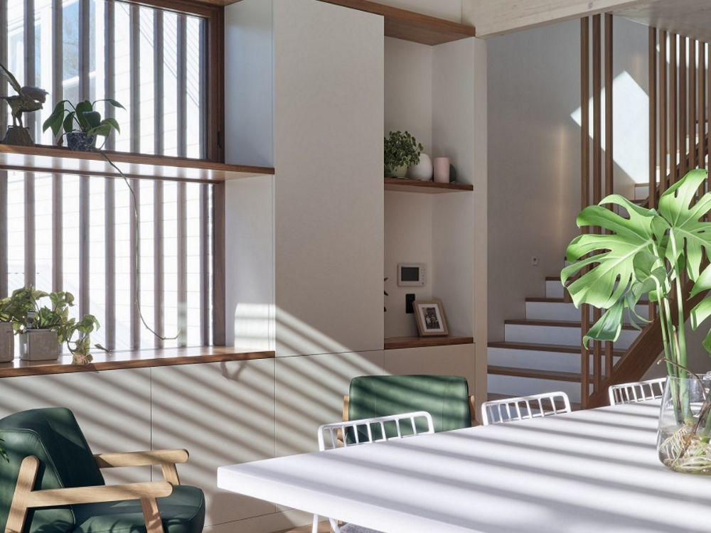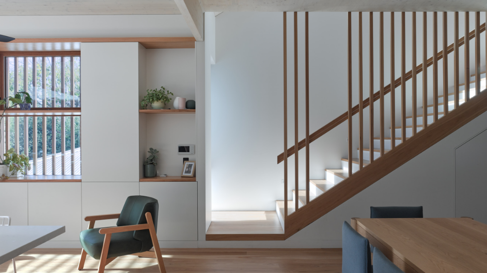 An upper-floor extension hosts the entry, main bedroom, ensuite, and robe. This extension was constructed from Cross Laminated Timber (CLT) which was central to the sustainability strategy as CLT provides a structural system that does not require secondary internal cladding. This efficient use of materials is part of the de-materialised design philosophy which seeks to eliminate waste and celebrate materials in their raw form. All of the new building fabric including structure, cladding, and linings were selected to be carbon negative. The combination of maximising re-use, thoughtful specification of new materials, double glazed windows, insulation, and the inclusion of solar panels, and rainwater tanks results in a beautiful and environmentally friendly family home.