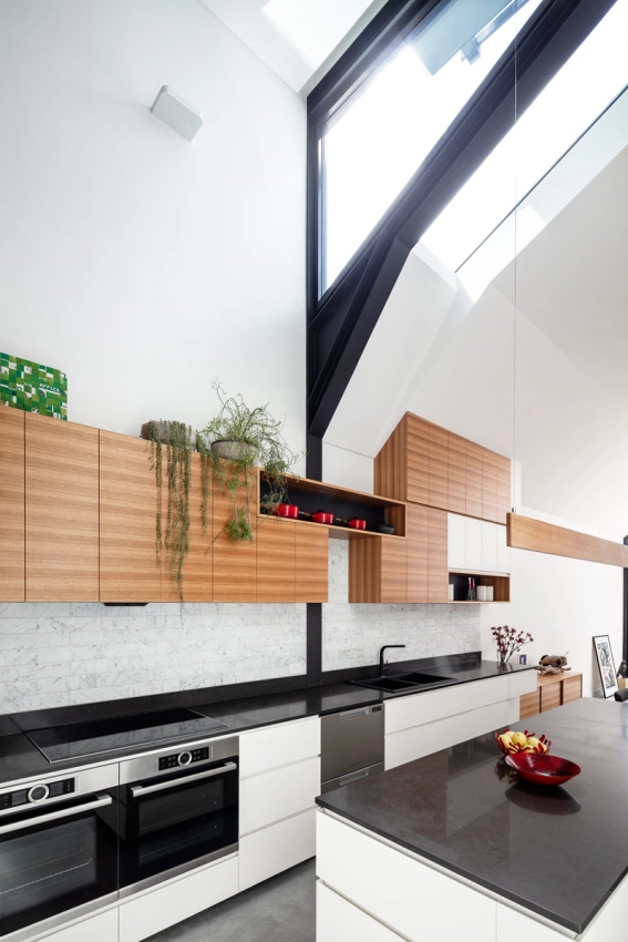 From the project’s conception, the passive, thermal and environmental performance of the home was central to the evolution of its design. The symbiosis of sustainable design and occupant comfort, often explored in the firm’s practice, both informed the configuration of the spaces and defined the unique character of its indoor environment. The thermal mass of the boundary walls and concrete floors, ensure that internal conditions are thermally regulated. Double and triple height void spaces and open floor plans allow for stack effect ventilation and the purging of warm air during the summer months, activated through first floor operable skylights. These elements of the design also allow for the distribution of heat, generated by the home’s incredibly cost and energy efficient in-slab hydronic heating system, up to the first floor during periods of cooler weather.