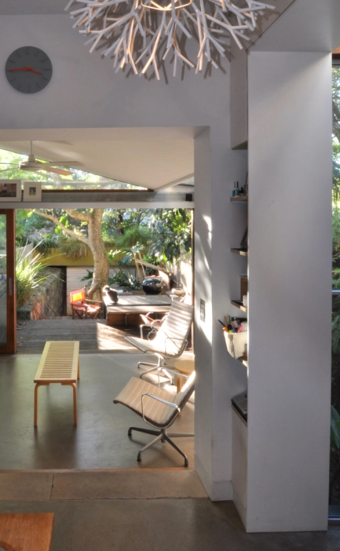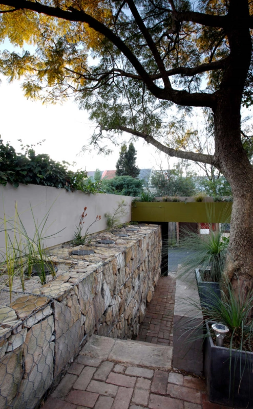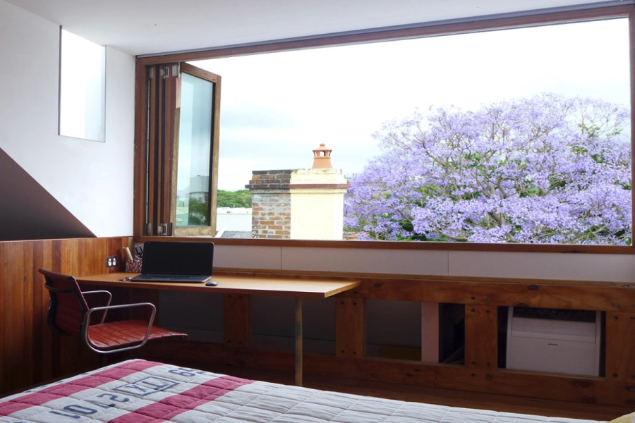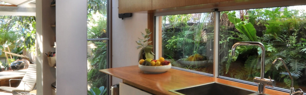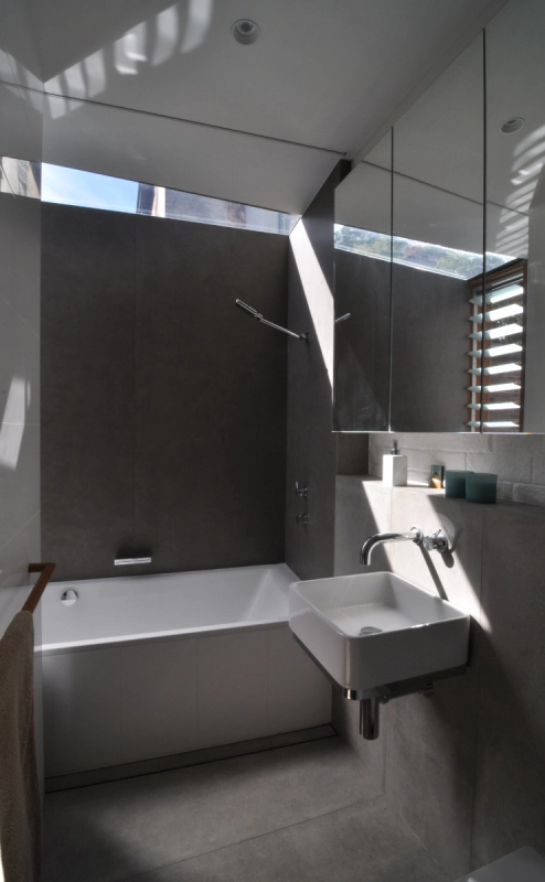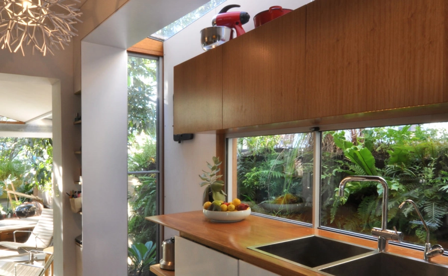 A medium sized terrace in the inner city, the design of the Recycled House focuses on reduction of the household’s material use, off-site energy and water consumption. This is achieved through implementation of sustainable strategies including solar panels, a solar-hydronic floor heating system, the collection of rainwater and the reuse of grey water in the home. Due to site limitations, the capacity of the site to store rainwater has been limited to 6000L. The grey water produced in the dwelling is cleaned by a reed-bed and reused for washing clothes, flushing toilets and watering the garden. Power consumption is reduced through the use of a 3kW Photovoltaic system, energy efficient light fixtures and fittings as well as a well-insulated concrete floor which provides high levels of thermal mass. The floor stabilises indoor temperatures throughout the year and reduces reliance upon electrically powered heating and cooling methods.