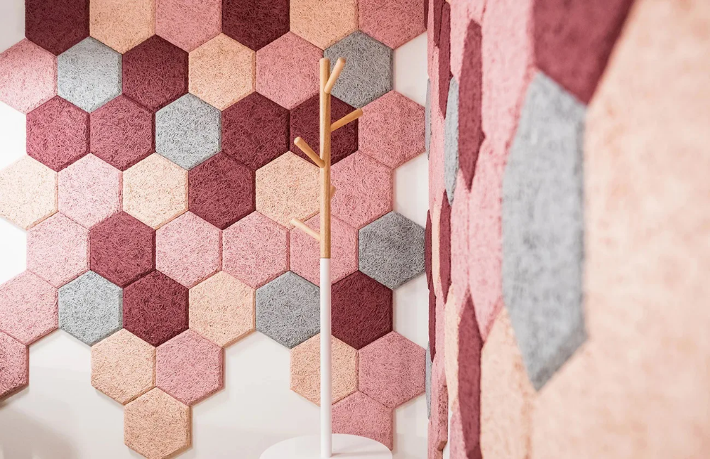 Base 1, measuring over 100 sqm, combines floral and geometric influences. BAUX Small Hexagons in shades of pink and purple line the walls in an elegant honeycomb pattern. Base 2, by contrast, makes use of BAUX Large Hexagons in cool shades of blue, grey and green for a more aquatic feel. Base 3 is tonally sombre, with BAUX Panels in grey and black dominating the walls. Bases 4 and 5 share a similar design. For this project, BAUX products served dual purposes: both as an acoustic solution and as a visual graphic. Each colour, shape and pattern was carefully picked according the particular look and feel of each room.