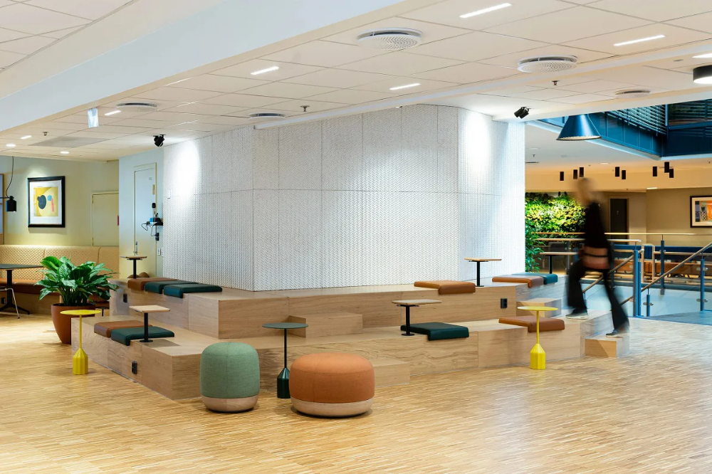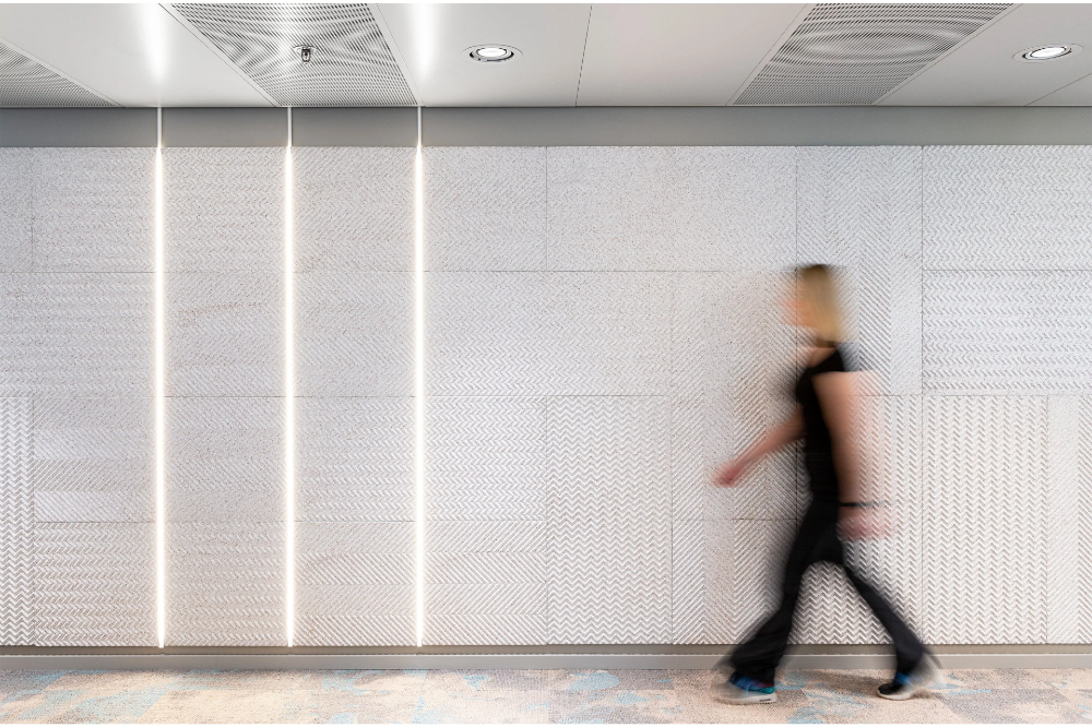 Throughout the building, BAUX products have been used to create optimal acoustics and a unique visual identity for each floor of the building. In some spaces, colourful BAUX designs radiate creative energy whilst in others, muted murals create a subtle backdrop for focused conversation. In walk through passages, spotlights have been placed as eye catching intersections between BAUX tiles. Aesthetically the building is modern, welcoming and professional.
