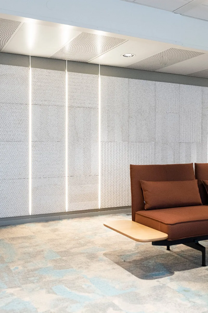 As part of the renovation of the existing building, Fremtind adopted a new activity based method of working. Throughout the building there are many open areas, which makes work easy and transparent. In these types of open spaces however, clusters of conversation can create background noise, which can easily distract workers. To reduce sound reflections, BAUX Pulp has been used extensively in common areas and meeting spaces. As well as being 100% sustainable, BAUX Pulp effectively absorbs sound reflections in the human voice spectrum, to create a beautifully harmonious workspace.