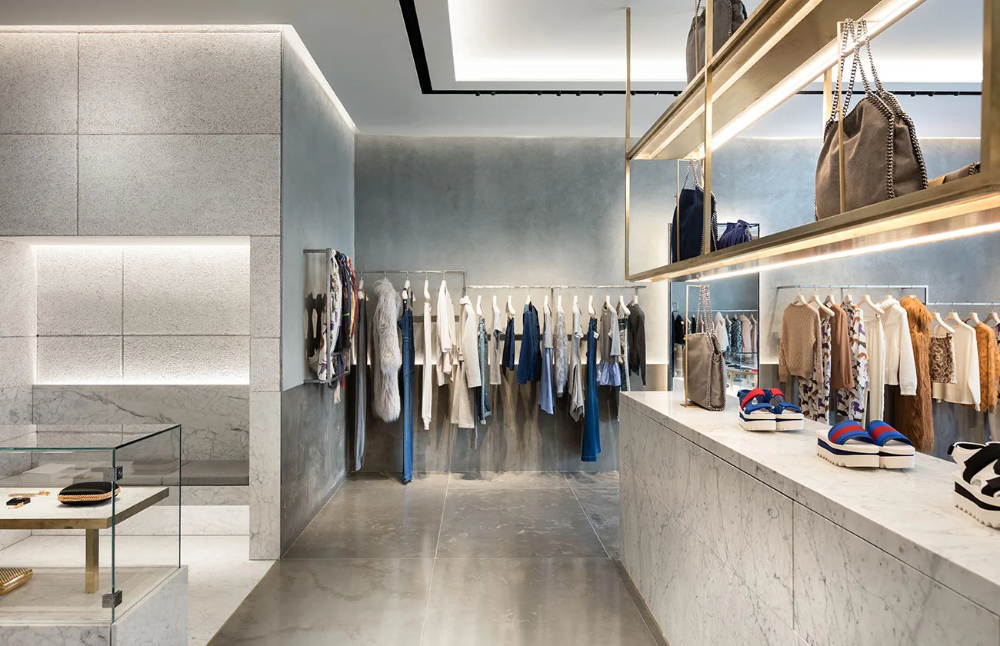 Stella McCartney’s stores are a visible commitment to her respect for nature and her passion for sustainably sourced materials. Like BAUX, Stella believes that modern design should be beautiful and sustainable. The Milan store is located in a stunning 18th-century neoclassical building with integrated Calacatta marble running through the ground floor and staircase. Large white rectangular BAUX tiles and linear brass and steel walls rails create an exquisite milieu for Stella’s signature designs.
