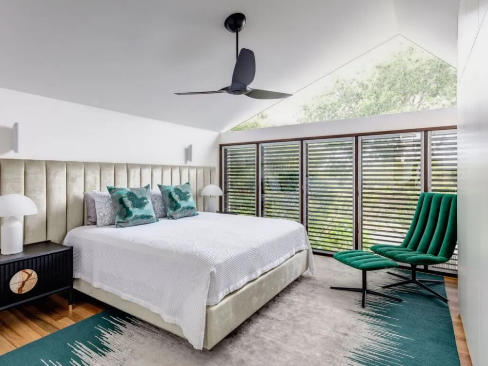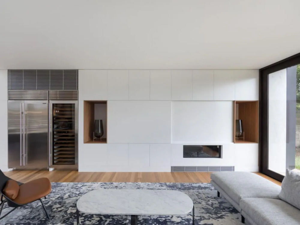 The design delivers generous living and entertaining areas which flow to outdoor areas at ground level, while an elevated external corridor connects the children’s bedrooms which have outlook onto green spaces and the swimming pool.
