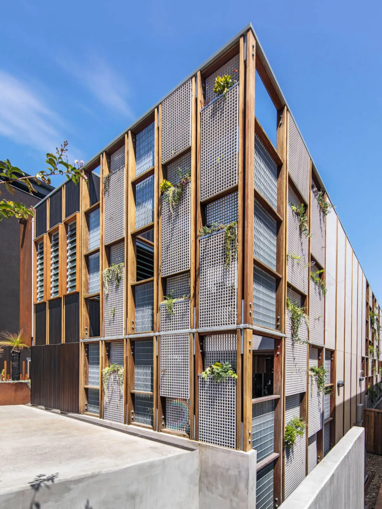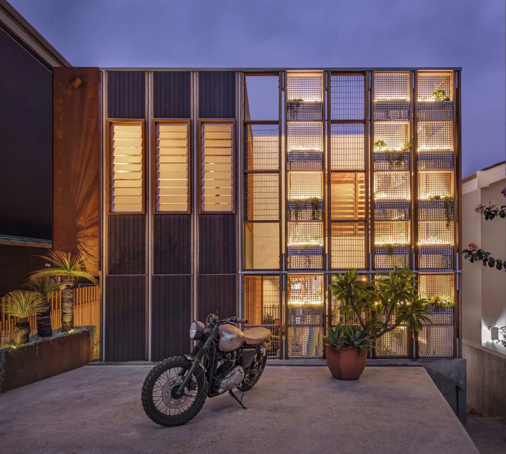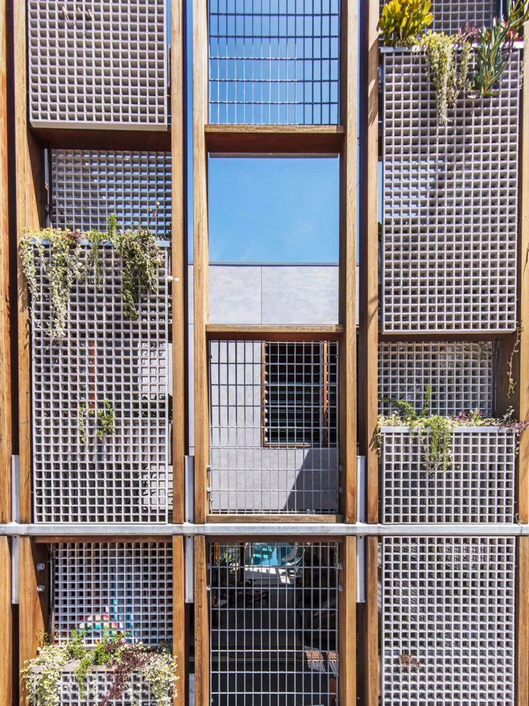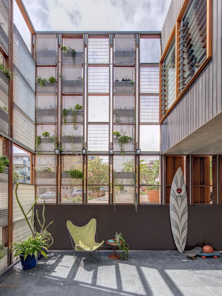 The narrow site is overlooked by neighbouring double storey houses and low-rise apartment blocks, creating significant privacy challenges. The form of the final building was driven by the need to resolve these concerns while creating indoor and outdoor spaces to live, passive solar design and natural daylighting principles. On approach, the green wall and custom planter beds are immediately visible and conceal a range of functions beyond. They ensure privacy from neighbours and pedestrian traffic, while also providing a natural green outlook from inside each space.