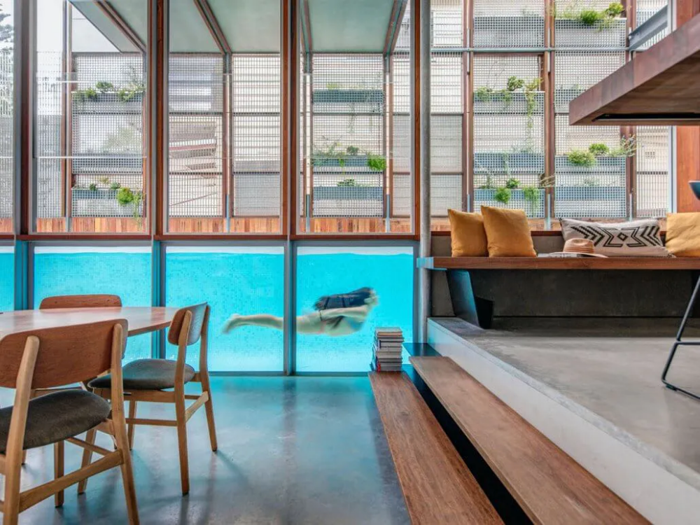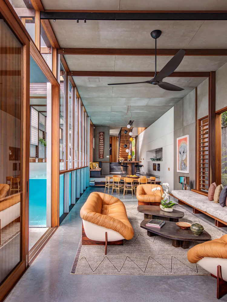 Downstairs, the interconnected kitchen, living, dining and outdoor spaces create highly interactive and engaged spaces designed to accommodate large groups easily. Smaller groups can retreat to the media room which overflows into the private entry courtyard. Secure storage for sports equipment is accessible from the entry, which makes it easy to grab a surfboard and head to the beach after work or school. A galley style kitchen and island bench include carefully considered lighting, while custom built-in seating provides guests somewhere to recline and converse. The pool shares a clear wall with the double height social space and acts as a visual connection between the interior and exterior spaces, refracting natural light throughout the lower level of the house.