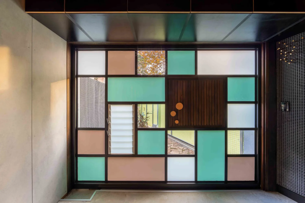 The fully operable glass inner skin of the home is inset from the outer punctuated masonry façade, providing an abundance of light and outlook whilst maintaining privacy from the public realm. This interstitial zone provides passive thermal regulation across the upper floors with planter beds ‘floating’ in between the glass and masonry skins to provide outlook to greenery and cooling to internal spaces via transpiration. The floating planter beds are also an integrated structurally engineered solution to the lateral bracing needs of the masonry wall.