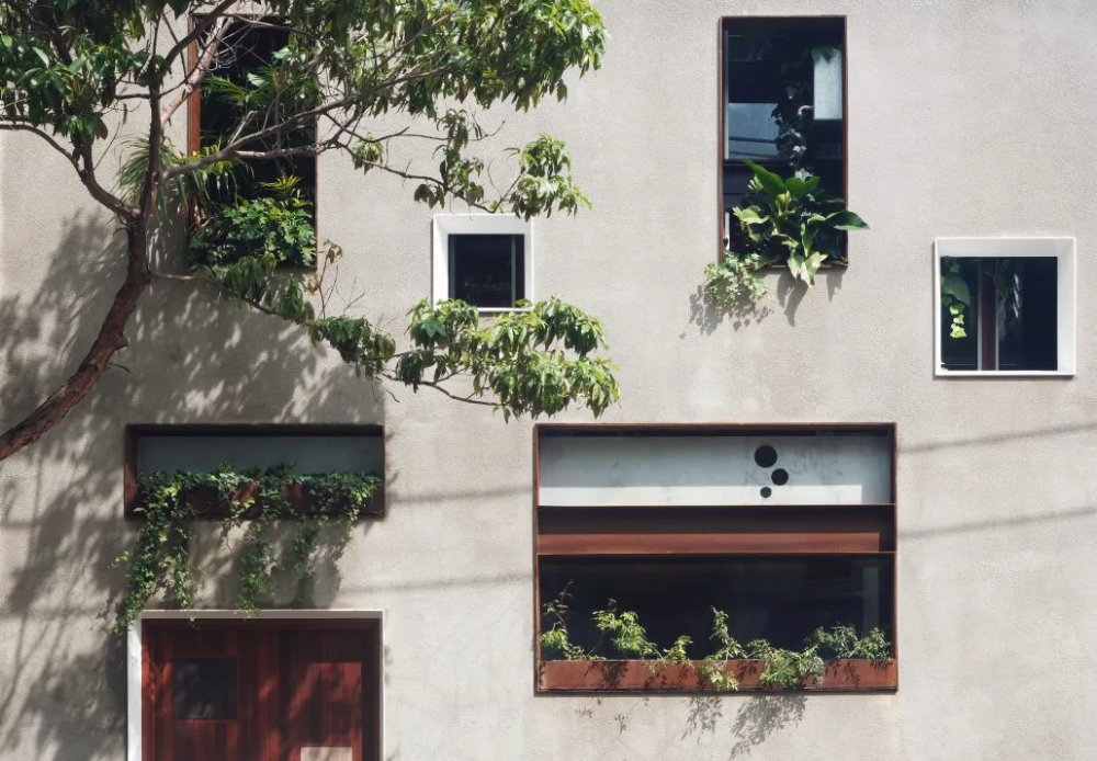 Built within a rejuvenated heritage façade of rendered masonry, steel, timber and greenery, the Welcome to the Jungle House is situated in an inner-city heritage conservation area typified by late Victorian row terrace housing and post-industrial warehouse conversions. A two-storey shop top house in disrepair and close to collapse originally occupied the 90sqm triangular site. The original spackled rendered masonry façade had cultural and streetscape significance to the local heritage conservation area and its necessary reconstruction was managed under strict heritage controls. Original window openings have been framed in pre-rusted steel and juxtaposed with new openings framed in gloss white powder coat steel. A black photovoltaic panel array signals the new addition to the original northern façade, harnessing sunlight throughout the day, acting as a billboard for the sustainability attributes of the architecture and starkly contrasting the original rendered heritage facade.