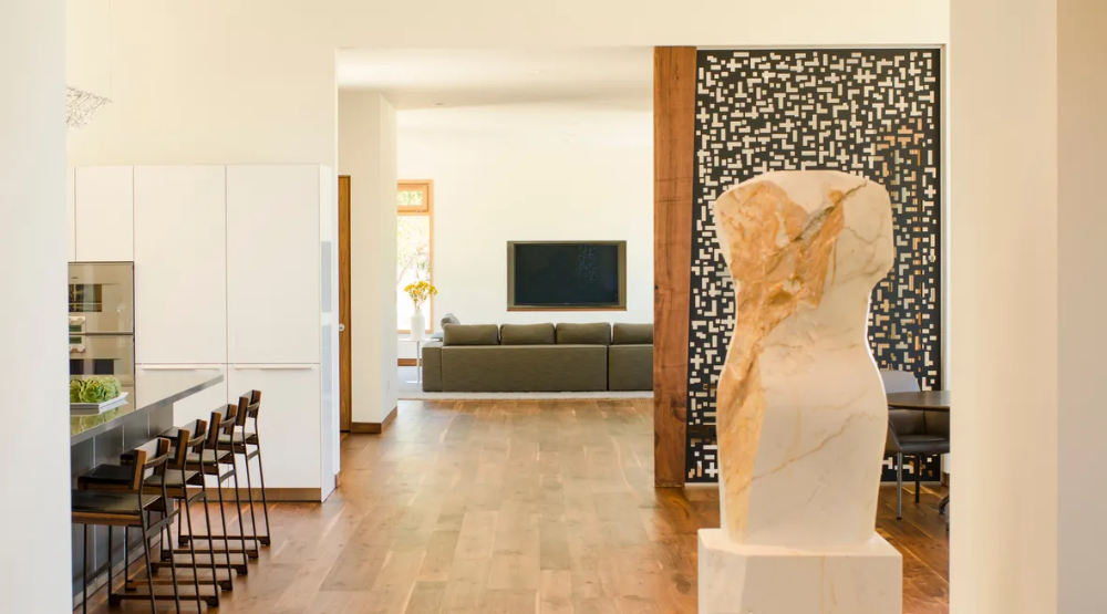 The home is completely “wired,” meaning that all appliances, control systems and smart-home technologies are connected directly via low-voltage cables instead of remote wifi connections. This provides both greater stability for the system (a failing battery will never be a factor in how the home performs) and greater security for the occupants (a hard-wired system is much more difficult to gain access to for outside hackers). When it comes to energy conservation, knowing is half the battle. With this in mind, every single electrical circuit in the home has a sensor attached to it, which reads the electromagnetic flow and feeds that information into a centralized data collector, informing the homeowners about how systems are performing. The homeowners can easily monitor details, such as how much energy their refrigerator and lights are consuming, react accordingly, and adapt their behaviors over time to save energy and money.