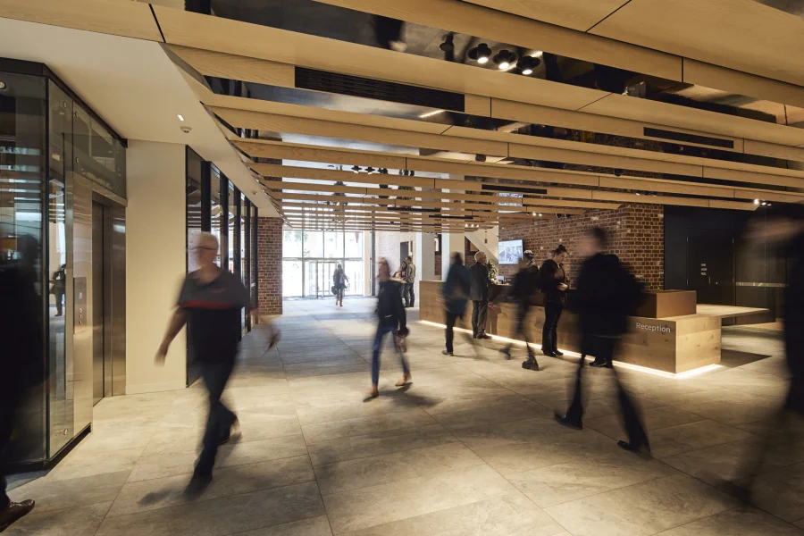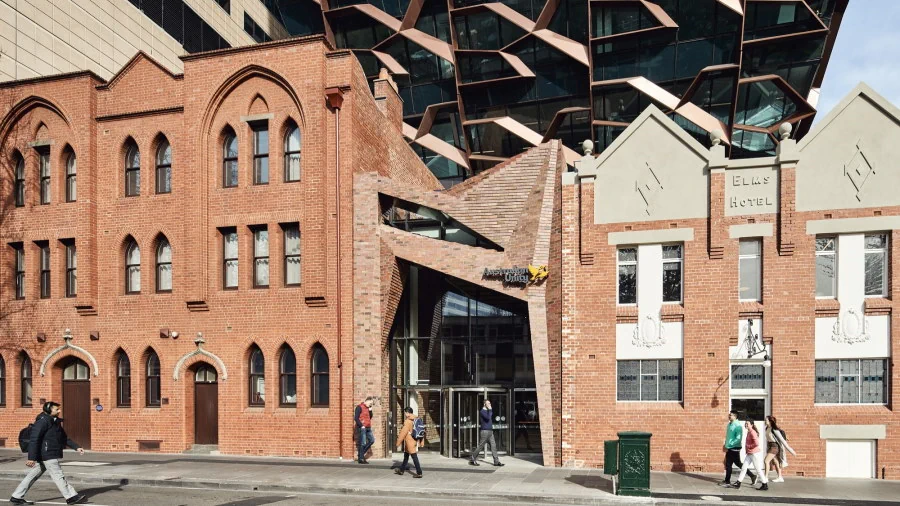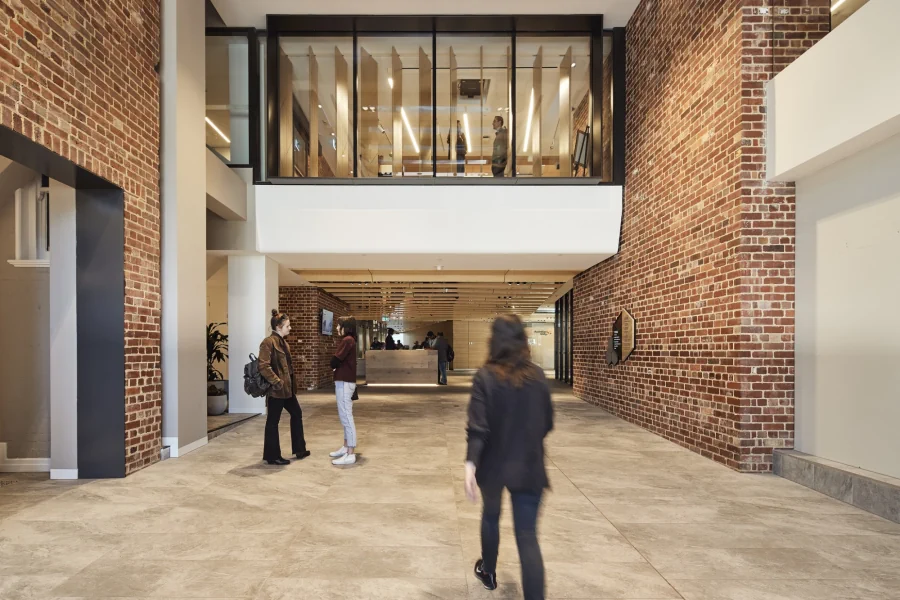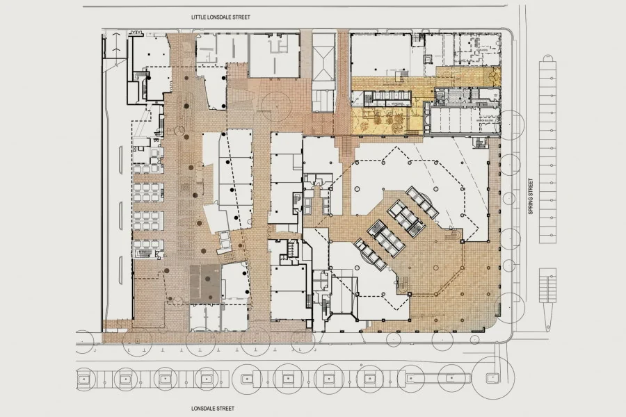 A new office building at 271 Spring Street retains, reveals and expands upon the history of its site to create a new workplace revelling with its place in the city. It is part of the original vision for the Urban Workshop at 50 Lonsdale street, a well-known and successful example of urban renewal in Melbourne. This included a major new commercial office building and retail precinct set around the historic buildings and street patterns of the area once known as the Little Lon district. In a similar way, the new office building incorporates a brick podium that is partly original and partly reimagined around historic elements including the Elms Hotel and the Mission Building. Overall, a streetscape of two storey brickwork makes for a scale and material appearance consistent with its neighbours along Little Lonsdale Street. It is not overtly grand, but rather scaled for people and aims to create an engaging relationship with the passerby.