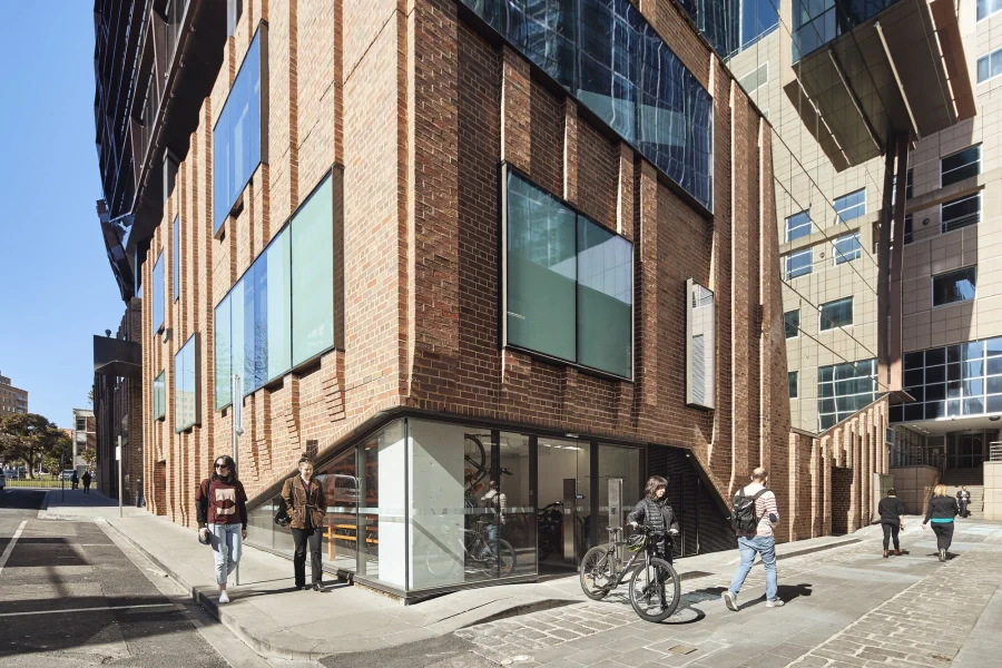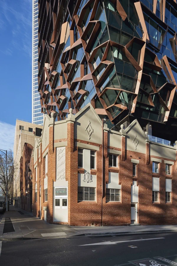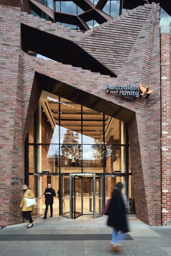 Separate from the brick podium is the office tower proper, its curtain walls incorporating sun shading to improve thermal performance. Expanding this texture further, the patterns of historic roofs hidden from view are writ large upon the inclined glass face of the tower above. A new geometry for sun blades is drawn from the old roof patterns. The site's constraints are many and varied. The building's structure responds to heritage facades, electrical infrastructure easements, adjacent buildings and the Melbourne underground rail link tunnels directly below the site. The resultant structural frame is uniquely shaped - a very specific response to its context.