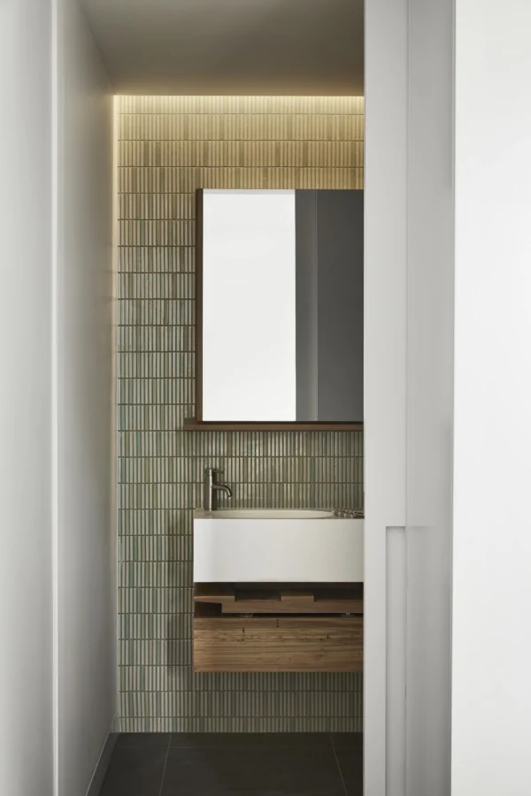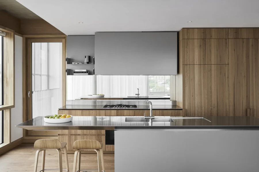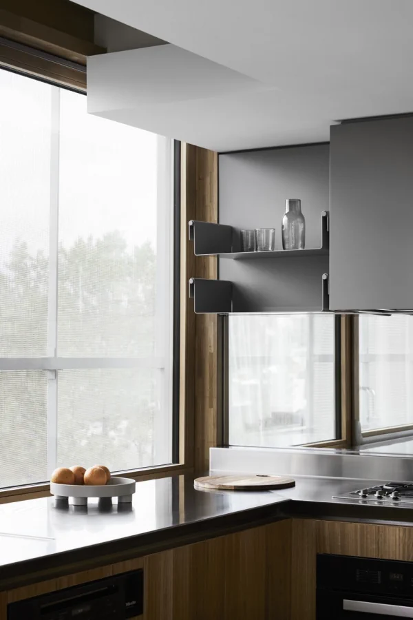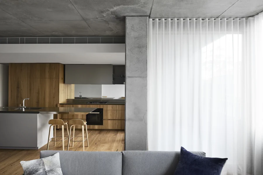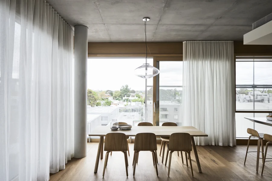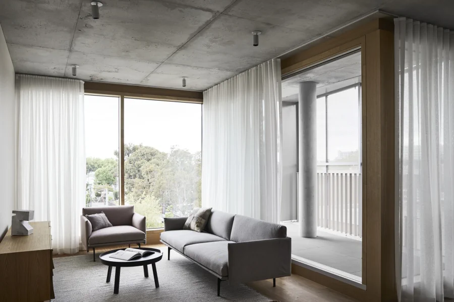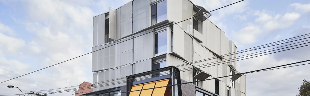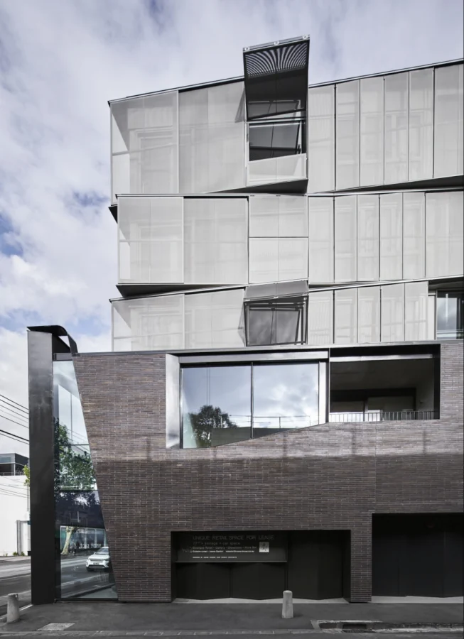 Transient in nature, the upper level apartments are veiled behind a series of operable metal screens, providing thermal protection and privacy. Each screen type responds to the individual, creating an inhabited edge that is constantly shifting. Their materiality and colour are mute, merging with the background of a typical Melbourne cloudy sky, whilst acting as a counterpoint to the grounded character of the brick podium. The one and two-bedroom apartments are orientated to maximize views, daylight and ventilation. The upper levels are enclosed by high thermal-performing timber framed windows, providing intimacy and warmth in a refined material palette. To the first floor the solidity of brick provides a visual and acoustic buffer to Malvern Road, whilst the steel framed windows and openings are scaled for privacy and framing of views.