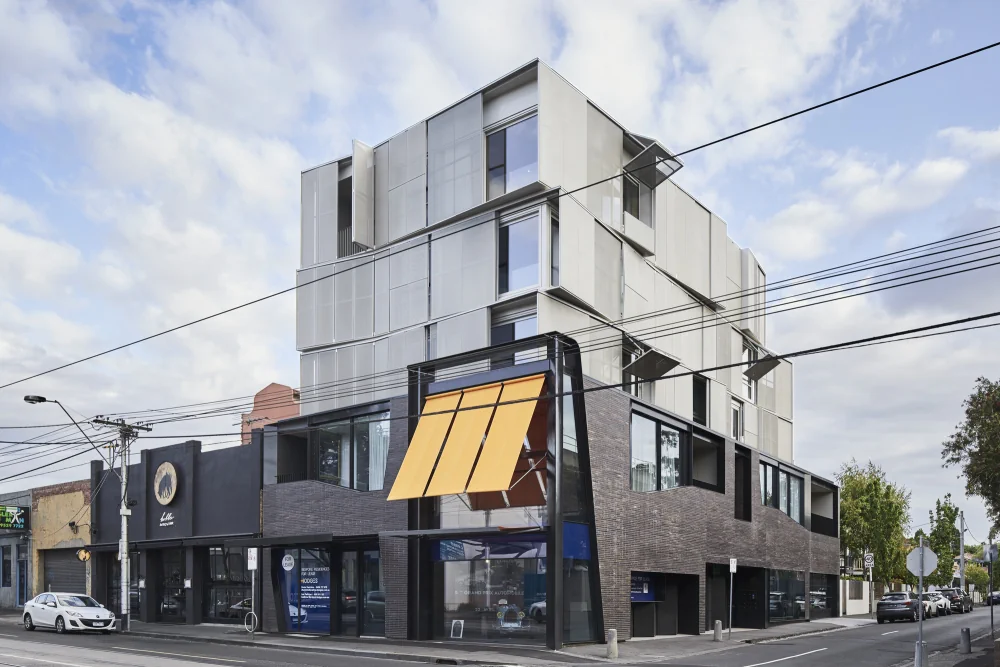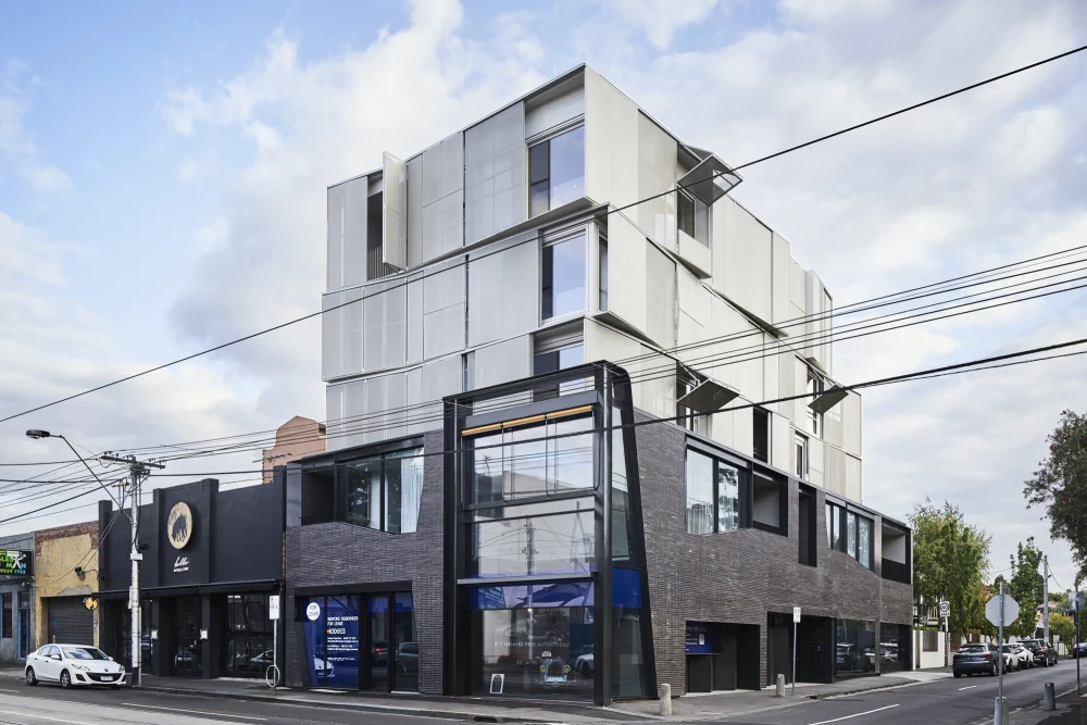This finely detailed residential development appears in a constant state of flux, its edges moving and shifting as it responds to its inhabitants’ use. With eight generously sized apartments and retail space at ground level, the five-storey development seeks to provide unique residential amenity whilst restoring a once dilapidated industrial automotive site. A two-storey podium of custom made brick and steel framed windows is activated by a series of apertures and portals, revealing the use and activities of the spaces within. A large picture window showcases the inner mechanics of a triple height car stacker storage system, a reference to the history of the local automobile industry on the site. A double height void within the corner retail space illuminates as a lantern, signifying the prominence of the corner intersection of Malvern Road and Francis Street.