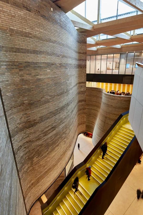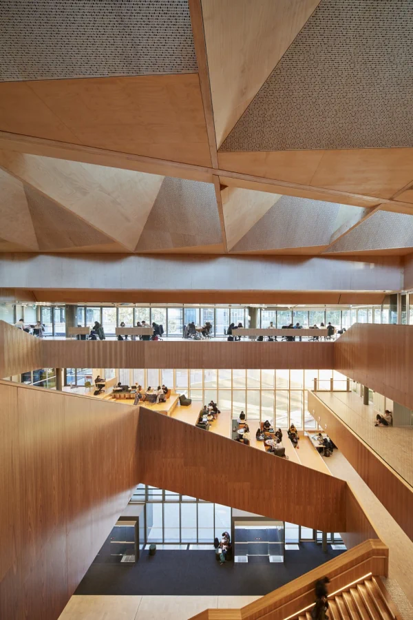 The learning activities of the interior are, in this way, made visible and accessible to the wider campus and community, rather than removed from the ground in a vertical structure.The LTB demonstrates a shift away from the modernist stand-alone tower instead incorporating a horizontal field of spaces set within a broad, low rise building.