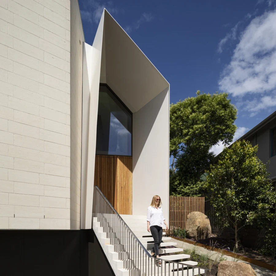 This energy efficient home wraps its occupants in a nurturing and healthy living environment. The envelope is robust and solid. Clad in Mt Gambier limestone, it will weather over time. The timber of the Dining room pavilion and study will similarly be allowed to weather to a silver grey. Natural materials which do not require long term maintenance. The street facing elevation is highly private but with enough windows cut into the stone surface to provide evidence of inhabitation. Additional openings are carved out of the stone surface of the north elevation. The largest is in front of a significant outdoor space which forms the centre of the house around which all other spaces are arranged.