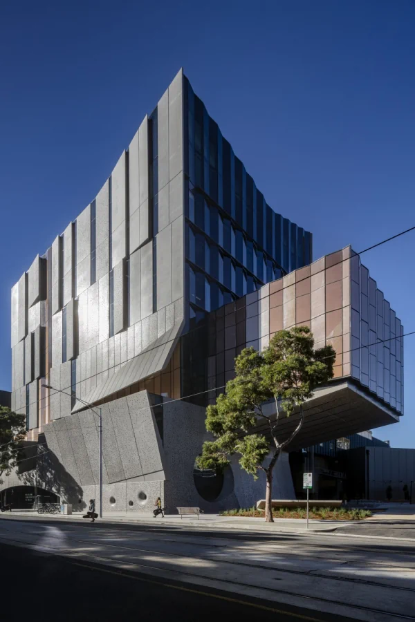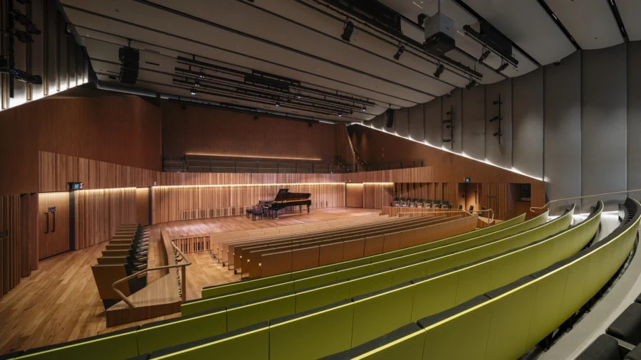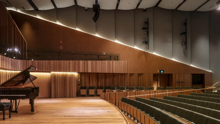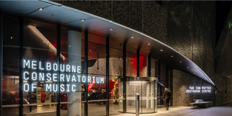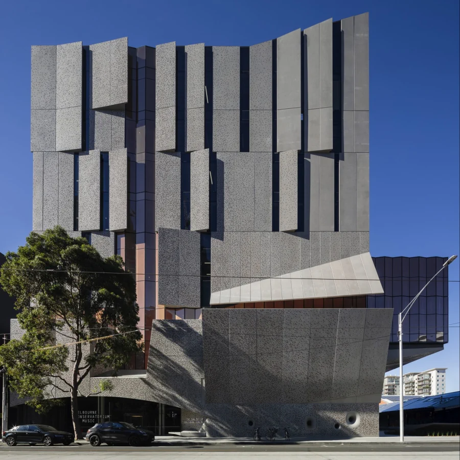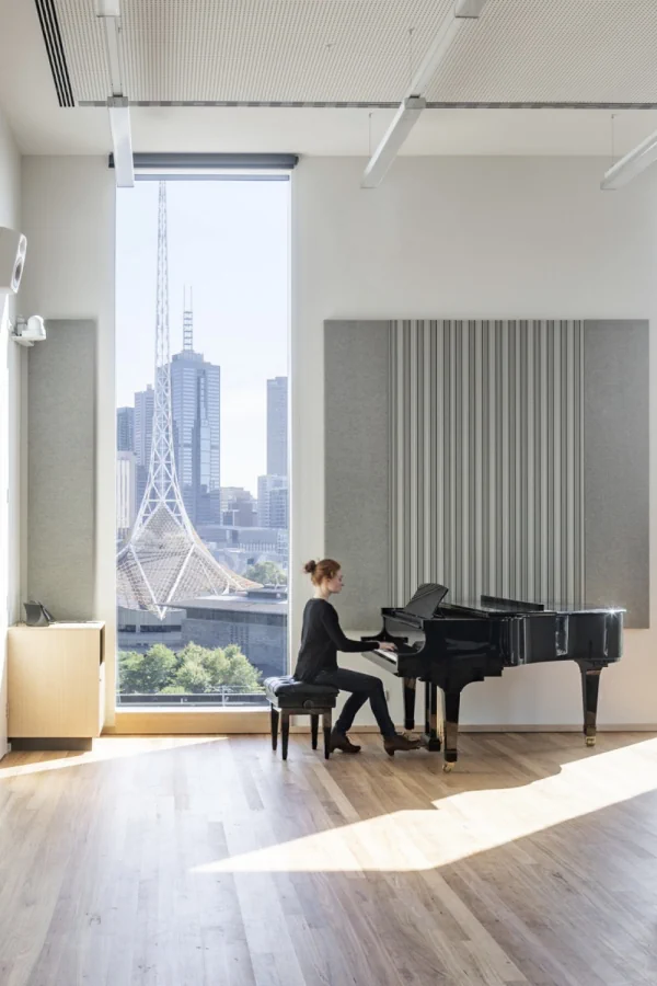 The new home of the Melbourne Conservatorium of Music celebrates the activities of music rehearsal and practice – a green room for Melbourne's arts precinct. Outwardly focused and inviting, the building balances the singular concentration required of students with the camaraderie of engaging with others. The building is a place to rub shoulders with fellow music students, and the artistic milieu of the wider campus and precinct.