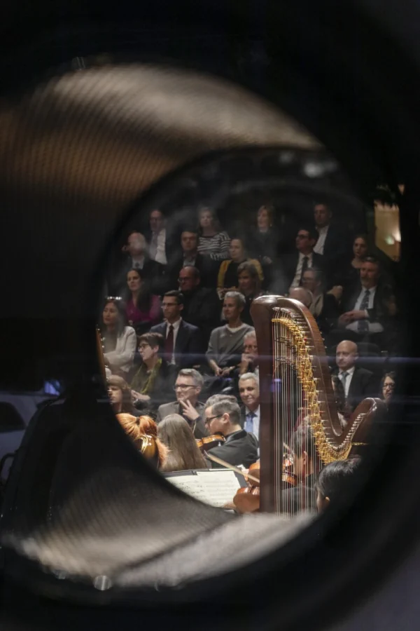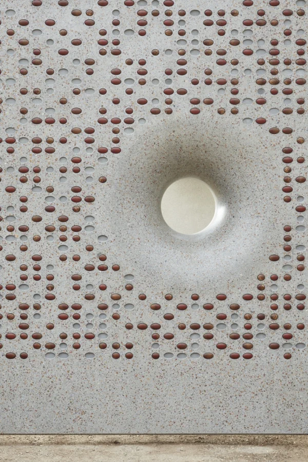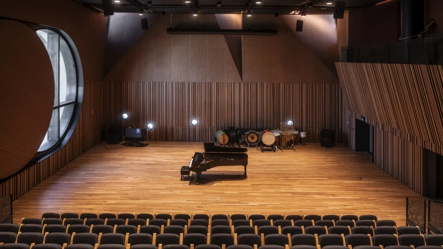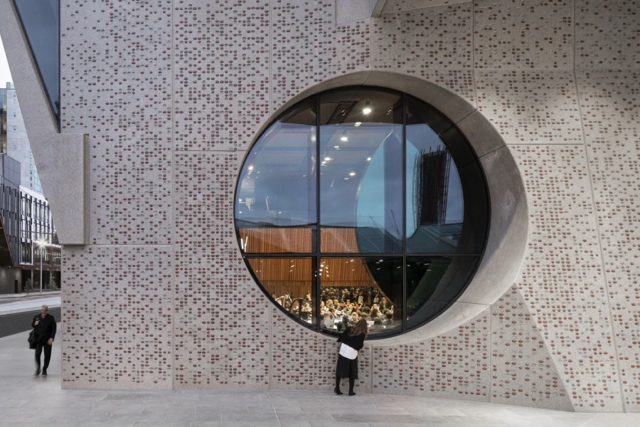 Numerous vantage points in the conservatorium allow for appreciating the inner workings of music teaching. The learning and rehearsal spaces are interspersed with bell-shaped portholes, hinged panels and disguised windows that generously exhibit the activity within. The largest of these apertures is the oculus window located on the ground floor into the orchestral rehearsal space, which offers passers-by a glimpse into the inner realm of music education.