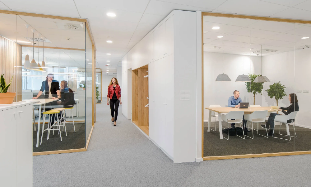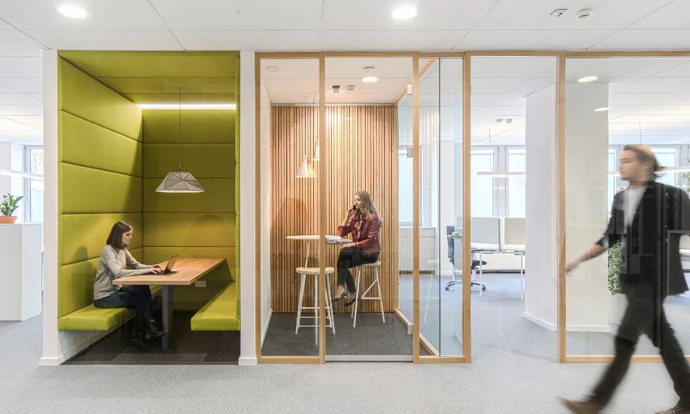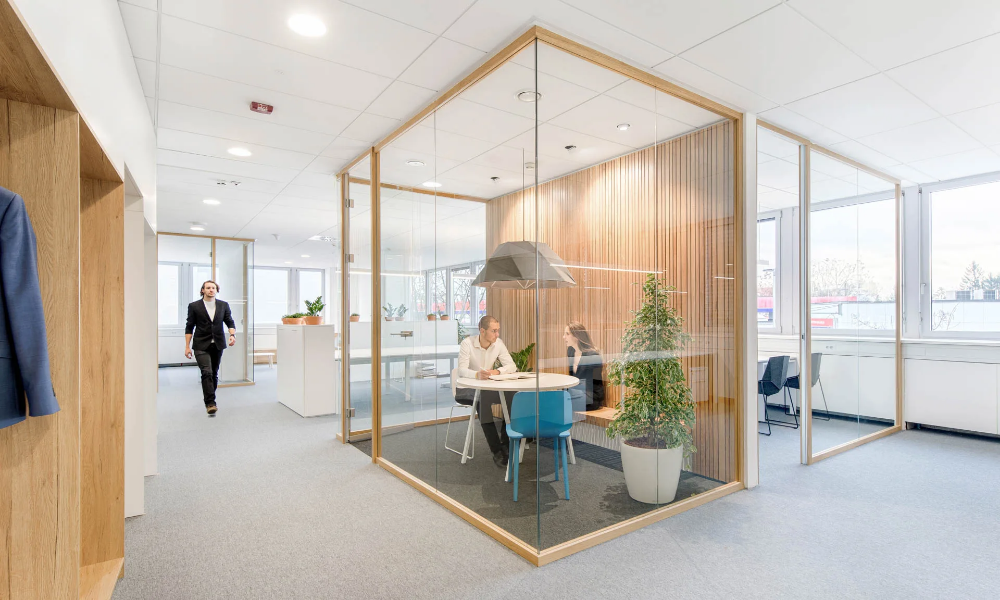 A lot of attention was paid to the functionality and ambiance of the common areas and meeting rooms which are now bright, spacious and made of natural materials. We put particular emphasis on wooden elements which serve both as a decoration and an acoustic lining inside individual booths.