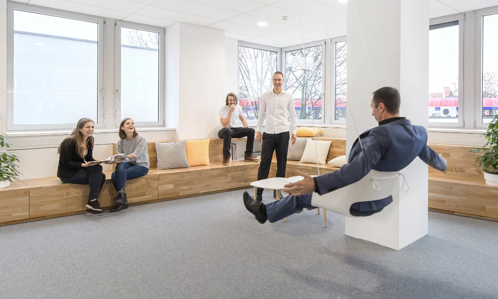Unlike Prva's previous workplace their brand new one offers a lot of ways for employees to socialize and exchange ideas. Besides cafeteria and kitchen we also designed a living room with a wooden podium that can serve as a morning meeting point or a place to relax.
