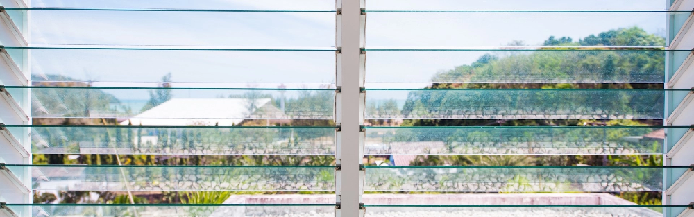 Louvre windows consist of horizontal slats (or "blades") set within a frame, which can be tilted to control airflow while keeping out rain and direct sunlight. The slats are often made of glass, wood, or metal and are commonly used in tropical and subtropical regions for ventilation.
