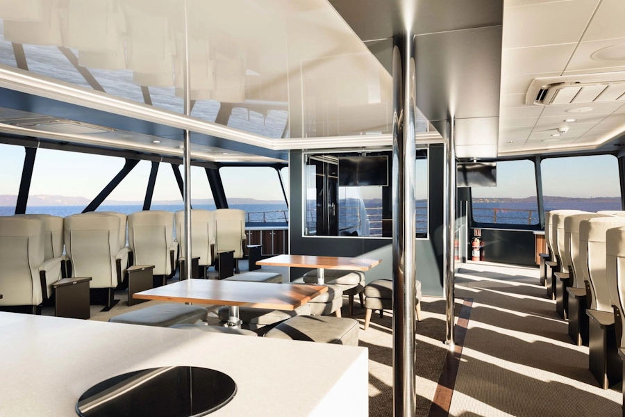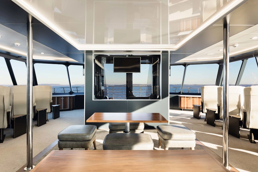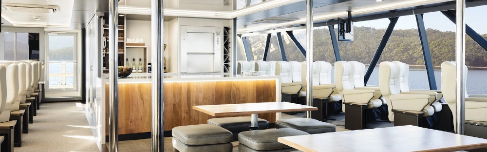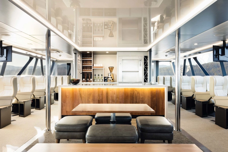 At just under thirty-four meters long, the ‘Spirit of the Wild’ catamaran was purpose-built for exploring the delicate and peaceful waters that lie within the UNESCO Tasmanian Wilderness World Heritage Area. The exterior of the boat features a unique tannin-like finishing to reflect the boats stunning natural surroundings. A first of its kind in the southern hemisphere, a hybrid propulsion system allows muted cruising on eco-friendly electric motors while on the Gordon River, allowing the boat and its passengers to be completely immersed in nature.