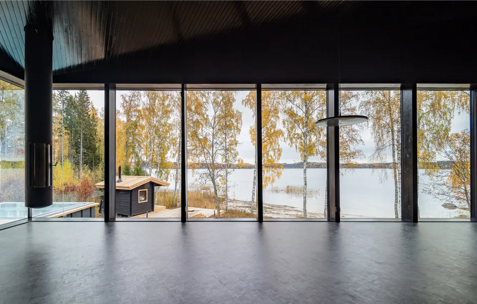 The building is approached from the south through a dense spruce forest, as the lake landscape slowly opens to the right on the east side. The spruce forest forms a natural and characteristic back wall for the construction site. It acts as a strong visual barrier along the western boundary of the plot, but also softens the place’s otherwise open sound landscape and adds a gentle, dark tone to it. At the beginning of the design, the plot was almost treeless and only one maple tree had to be removed to make room for the building. The rhythmic line of birches by the shore is an essential feature for the landscape opening from the interior of the house, and it also provides privacy when viewing the building from the lake. The steep stone embankment of the shore is repeated with the paving stones of the lower part of the house. The exact location of the building was largely determined by the views. The more north you move on the plot, the more the lake landscape opens, on the other hand the shortest distance to the shore was precisely determined. The old sauna by the shore had to be moved slightly in order to get the best view. Views have been sparingly opened towards the closest neighbor, located northwest, and towards the under-grown tree layer facing north, and the house is more enclosed in that direction. Instead of covering the large glass surfaces with interior curtains, a sun-blind was integrated into the outer surface of the wall structure, which does not allow heat radiation to enter, but allows views to the landscape to be enjoyed from inside the house.