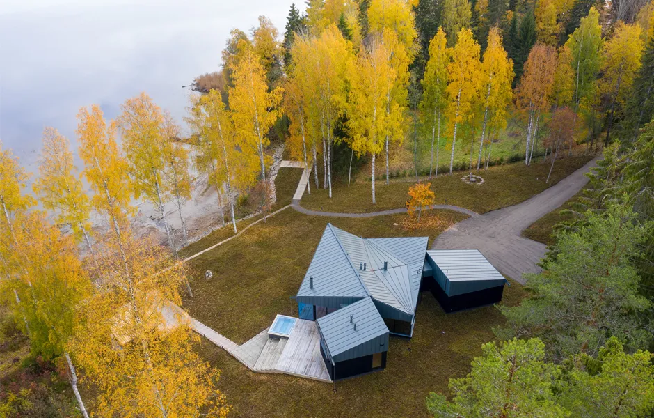 The building consists of three interlocking square masses. The locations of the spaces in different masses are strictly distributed according to the functions; the main mass contains the living, sleeping and dining areas, and the smaller ones have sauna and utility facilities, garage and technical facilities. The core of the main mass and the side masses are within the same coordinate system, which clarifies the connections between the spaces and calms the spatial experience. The basic idea behind the main mass is the core of the open square space, where all the fixtures are integrated and much of the functionality is located. The core has been shifted from the coordinate system of the main mass so that the use of the spaces between it and the outer walls could be optimized. The hallway, sleeping areas, entertainment corner and study are located in caverns created within this spatial distribution. Inside the core is a utility room, toilets and a walk-in closet. There is no traditional division into rooms, but spaces can be separated from one another by sliding doors if desired. The nature of the spaces varies greatly due to large glass surfaces and powerful openings to the landscape. The landscape itself is the most important element of the interior, which is alive and constantly changing according to the time of day and the seasons. On the lake side, the floor height of the building is clearly higher than the surrounding terrain to give the impression of floating above the lake. Similarly, the atmosphere of the spruce forest can be sensed in the living area, located in the western corner of the house, which has been raised to the height of the forest brush. This side is rooted in the ground, and less natural light seeps into the space so the experience is closer to that of the forest atmosphere.