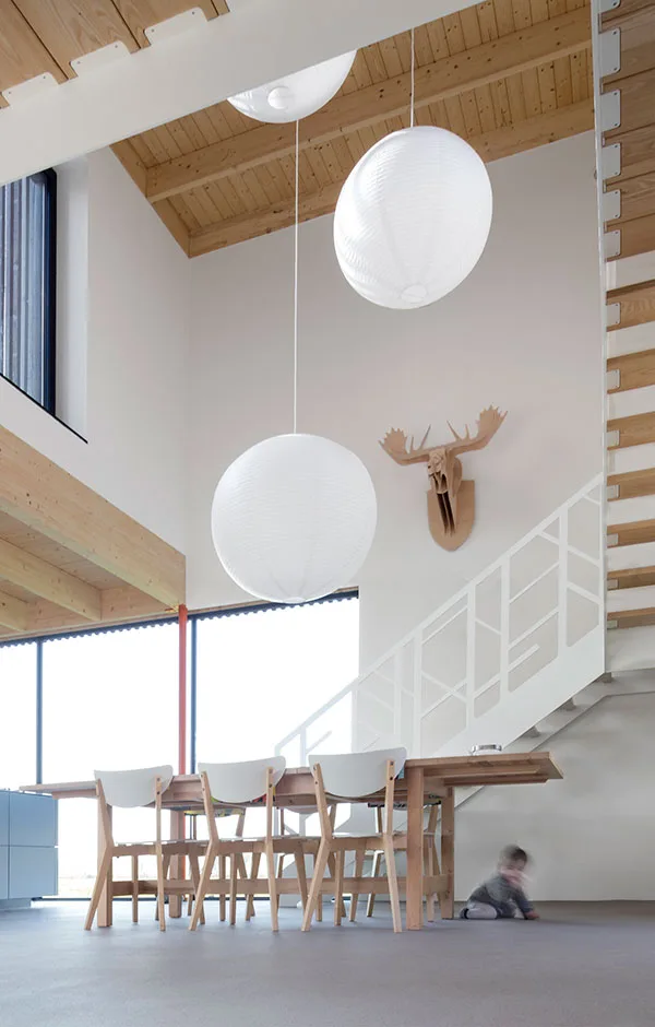 From the open living space the four main windows interact specifically with the landscape along each of the cardinal points. To the north a high window brings in the northern light. To the east a folded window embraces the enclosed garden. Towards the south a tube like window frames the view. To the west a huge window gives a panorama of the fields and the evening sun.