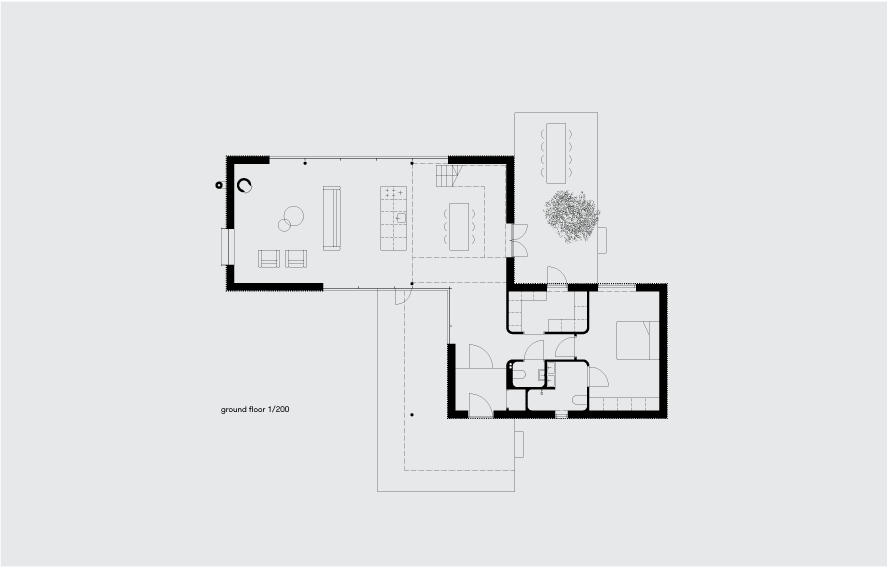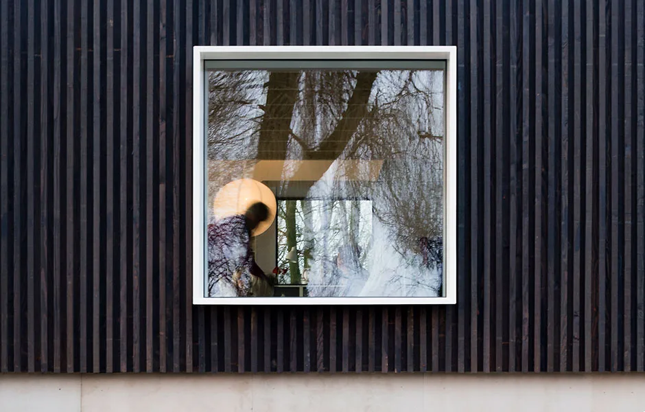 Local building regulations required the house to fit into the environment. By default that meant that the structure should be similar to the historical white plastered architecture of the neighboring houses. We opted instead to blend the house with the natural environment surrounding it. The dark, stained, vertical boards of larch make the building disappear against a backdrop of trees. The new house embraces the landscape and makes interaction with the surroundings its most important asset -both outdoors and inside.