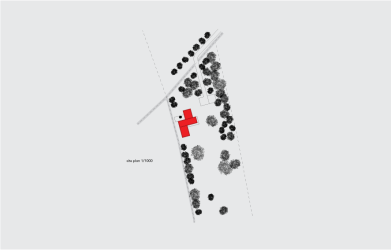 All that was left was the location and a few retaining walls. The clients decided against a replica of the original farmstead. Instead, they aspired for a contemporary, square-tube house where all the functions would be organized along a linear sequence. The tube developed into a knot, which engages better with the surrounding landscape by extending in every cardinal direction.