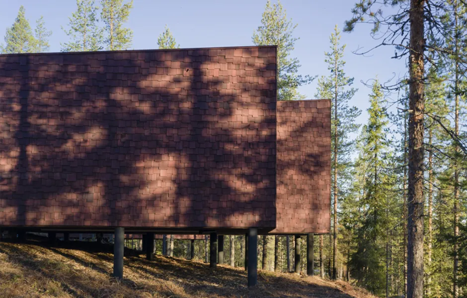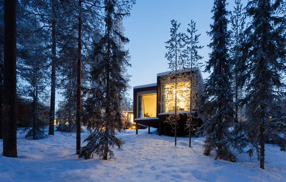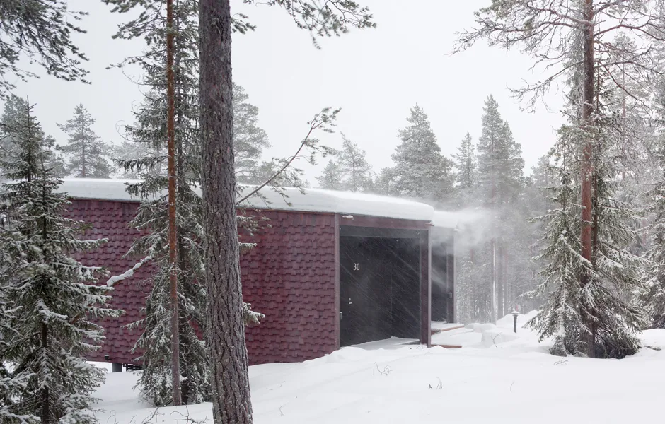 Light pollution outdoors has been kept to a minimum due to the northern lights and to enable a true wilderness experience. There are just enough lights for safe accessibility and to help you find your own sleeping place. Some beautiful, deliberately chosen trees have been lit to act as reference points. During evenings and nights the buildings glow on the terrain like lanterns, casting interesting shadows and inviting you to step into the warm indoors. During the day, the play between light and shadow on the interior and exterior surfaces enters the buildings into a delicate discussion with the surrounding nature and its materials.