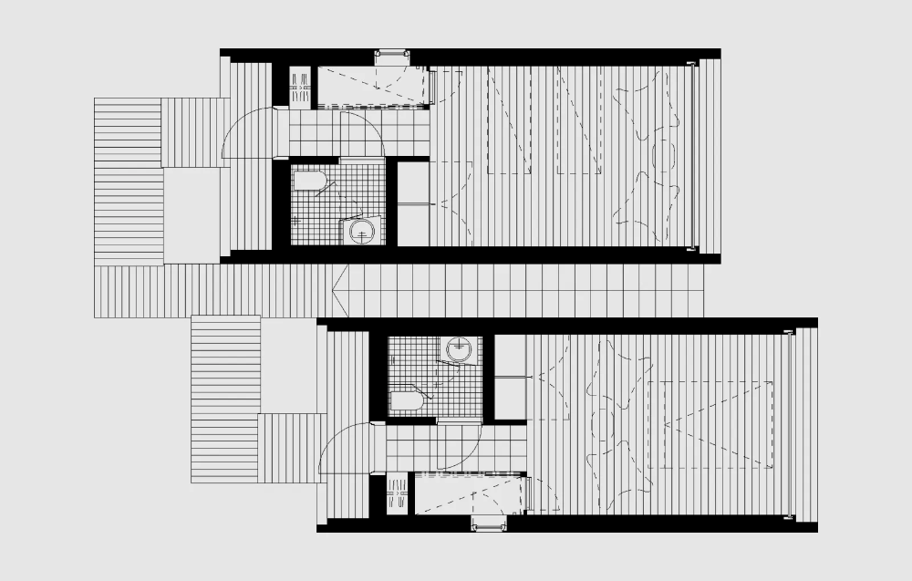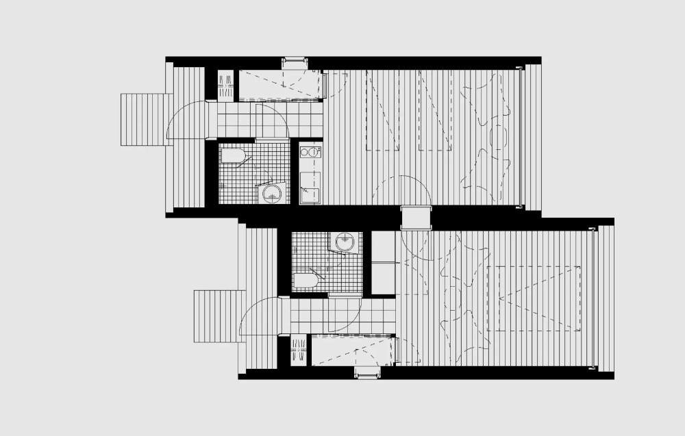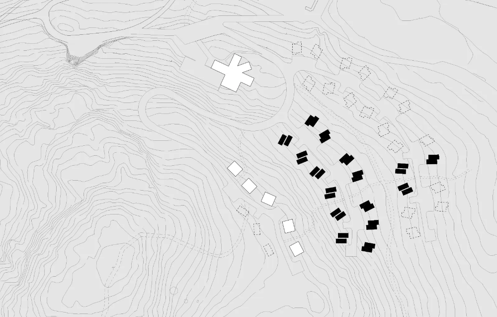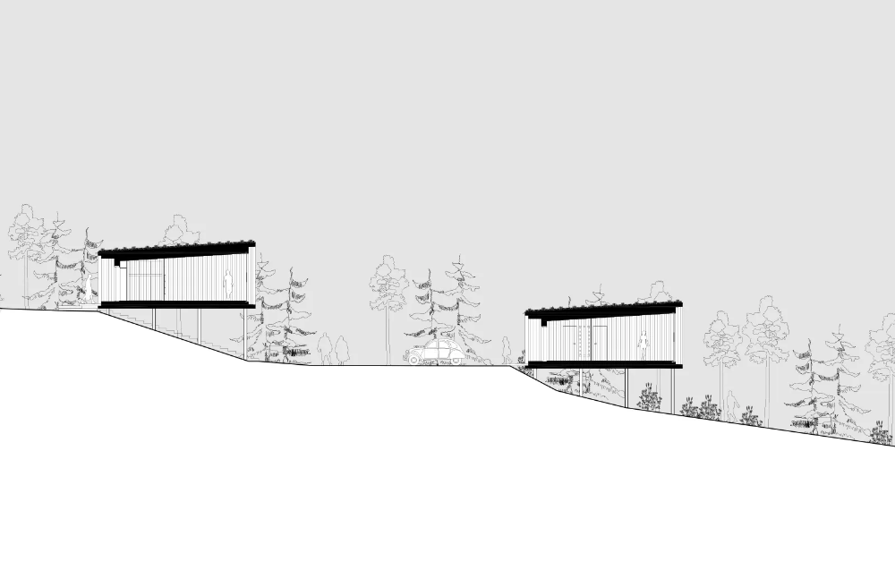 32 accommodation units have been placed in the nature in pairs and there are two different types. On top of the road, you’ll climb the stairs in-between the two buildings to get to the door. Under the road, each pair of buildings can be combined into one bigger unit, and these are entered directly from the street. One of the combinable halves will always have a mini-kitchen, the other accommodation units are equipped with a small fridge. The building will always be entered from uphill to the entrance hall, from which you’ll be able to enter the bathroom. The hall has a large storage area, and on top of it is a sheltered nest-like nook fit for one person to sleep in. From the darker hall you’ll step right into the light main area, where the amount of light will increase and the landscape will open up in its full glory. The wall facing the landscape is made completely of glass and every accommodation unit has been carefully positioned in a way that allows for the most unobstructed view of the scenery possible.
